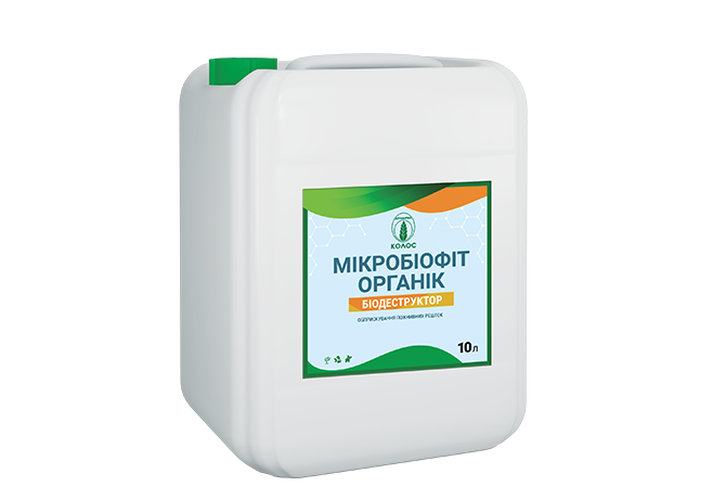 МІКРОБІОФІТ ОРГАНІК БІОДЕСТРУКЦІЯ ПОЖНИВНИХ РЕШТОК - препарат біологічного походження, який містить живі мікроорганізми: представники природної рослинної та ґрунтової, агрономічно корисної мікрофлори. Препарат розроблений за спеціальними рецептурами з урахуванням біологічних вимог сільськогосподарських культур.