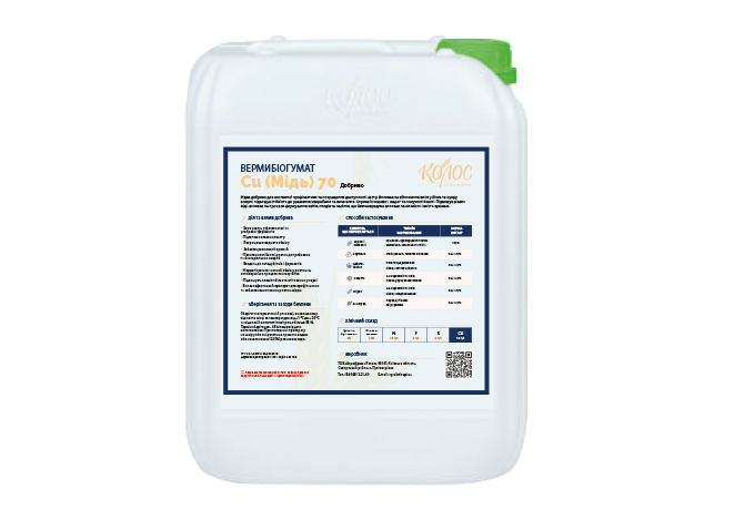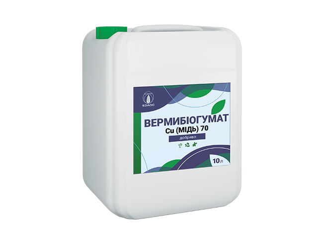 ВЕРМИБІОГУМАТ МІДЬ - Рідке добриво для системної профілактики та покращення доступності азоту. Впливає на збільшення вмісту білка та цукру в зерні, підвищує стійкість до ураження хворобами та вилягання. Сприяє їх морозо-, жаро- та посухостійкості. Підвищує рівень міді, впливає на процеси формування квітів, плодів та насіння, що безпосередньо впливає на кількість і якість врожаю.